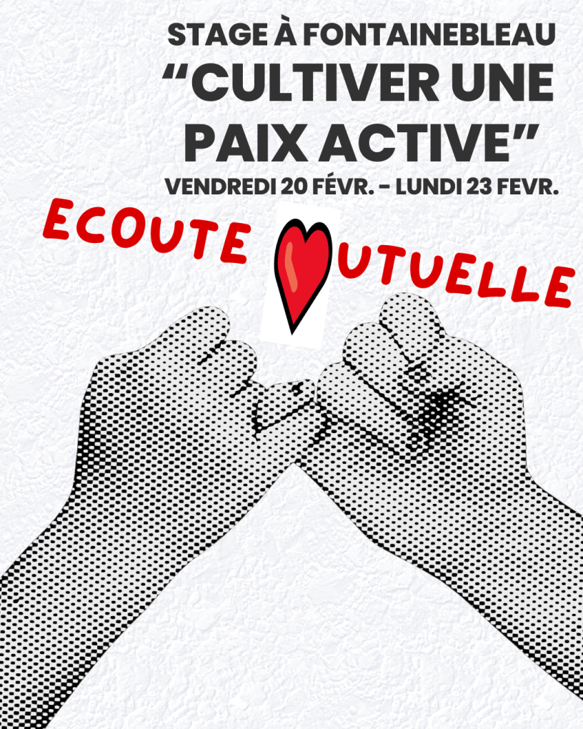 Nous vous proposons un travail qui se fonde sur l’Écoute Mutuelle pour donner de la Paix Active à vous-même, à vos proches, à vos actions engagées. Nous vous invitons à nous rejoindre pour le stage d’Écoute Mutuelle du 20 au 23 février, du vendredi soir au lundi après-midi.