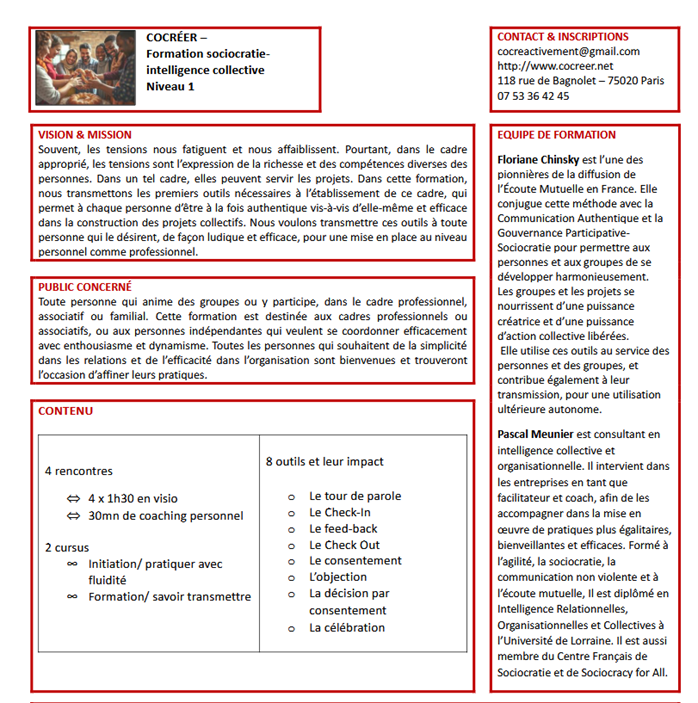 La voilĂ ! Notre formation en Intelligence collective et organisation est prĂȘte. Elle s’adresse aux personnes qui souhaitent mieux vivre l’organisation en groupe et avoir un impact positif sur leur entourage. Qu’il s’agisse du cadre familial, professionnel, amical ou associatif, des amĂ©liorations sont possibles. Vous trouverez (presque) toutes les informations ici, et pour le reste, contactez-nous!
