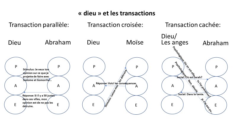 « dieu » est en position adulte lorsqu’il négocie avec Abraham l’avenir de Sodome et Gomorrhe. Il se comporte rationnellement Abraham répond de même.